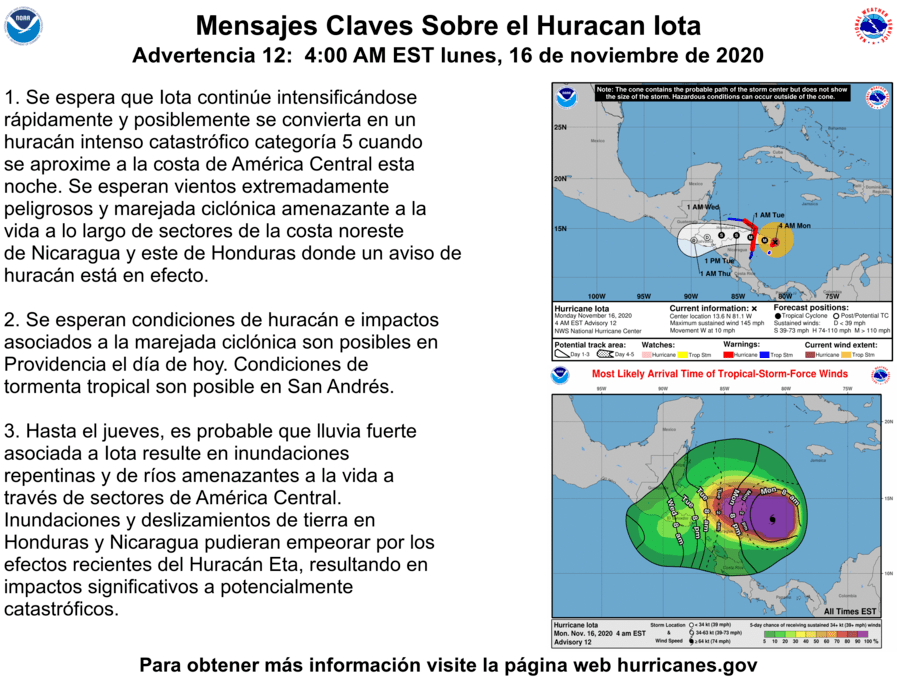 “Se espera que Iota continúe intensificándose rápidamente y podría ser un catastrófico huracán categoría 5 al acercarse esta noche (del lunes) a la costa de Centroamérica”, indicó el NHC en un reporte.