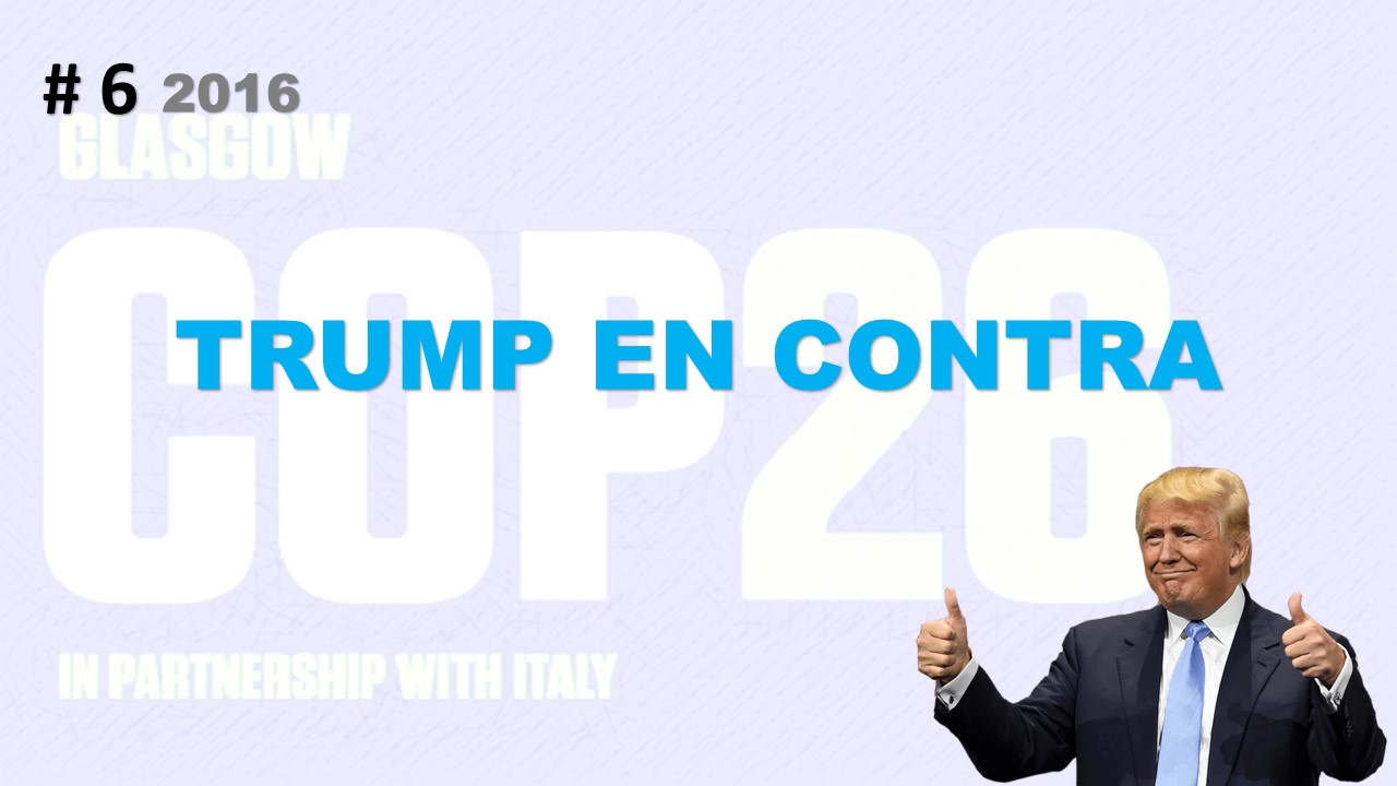 6. En el 2016 Donald Trump, previo a las elecciones anuncia que retirará a EEUU del acuerdo de París de ganar las elecciones. Los motivos es que no cree que todo lo que se ha hablado sobre las medidas contra el cambio climático favorezcan a EEUU.