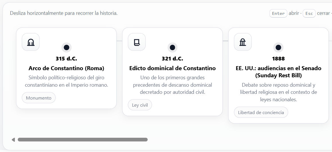 - 321 d.C. — Decreto dominical de Constantino. Se considera la primera ley dominical imperial que prohíbe el trabajo en domingo en el Imperio, estableciendo un precedente civil de alcance masivo. (Wikipedia)
